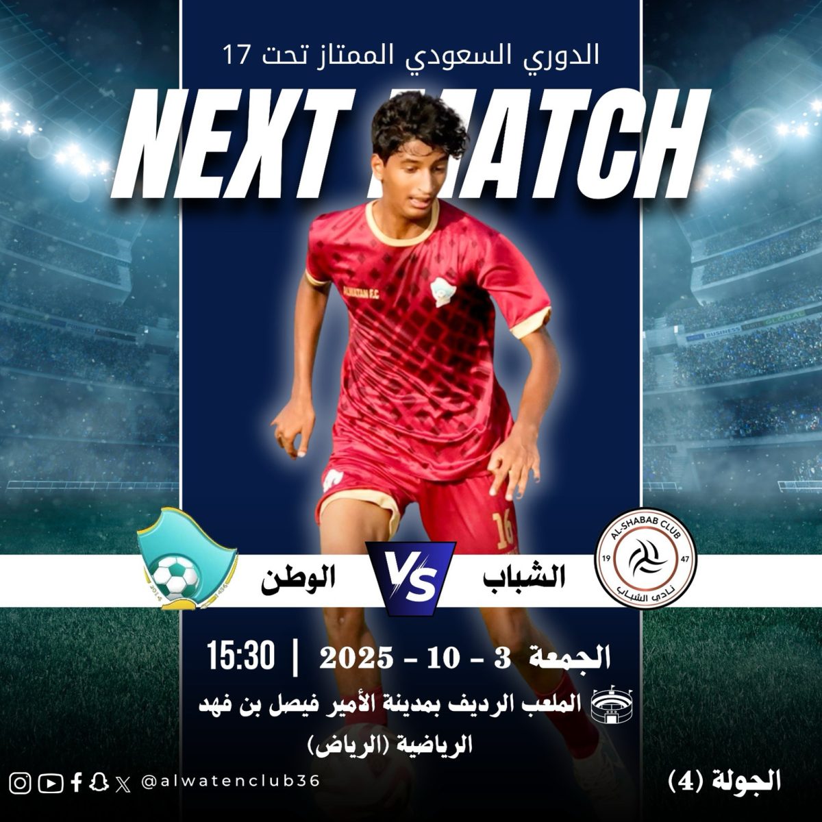الشباب 🆚 #الوطن 🏆 الدوري السعودي الممتاز تحت 17 🔢 الجولة (4) 🏟 الملعب الرديف بمدينة الأمير فيصل بن فهد الرياضية (الرياض) 🗓 الجمعة 3 أكتوبر- 11 ربيع الثاني ⏱ 3:30 مساء